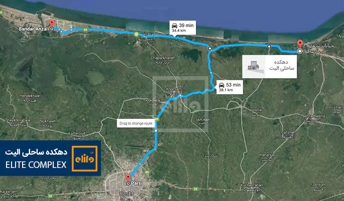 دهکده ویلایی الیت زیباکنار با طراحی دو ورودی اصلی از محورهای انزلی – خشکبیجار – کیاشهر و خیابان شماره ۲ دریا، دسترسی فوقالعادهای به مراکز شهری رشت، انزلی و کیاشهر دارد. این موقعیت جغرافیایی منحصربهفرد، باعث شده تا ساکنان شهرک بتوانند بهراحتی به مسیرهای بینالمللی، فرودگاه رشت ، منطقه آزاد کاسپین – انزلی و بنادر شمالی کشور دسترسی داشته باشند.